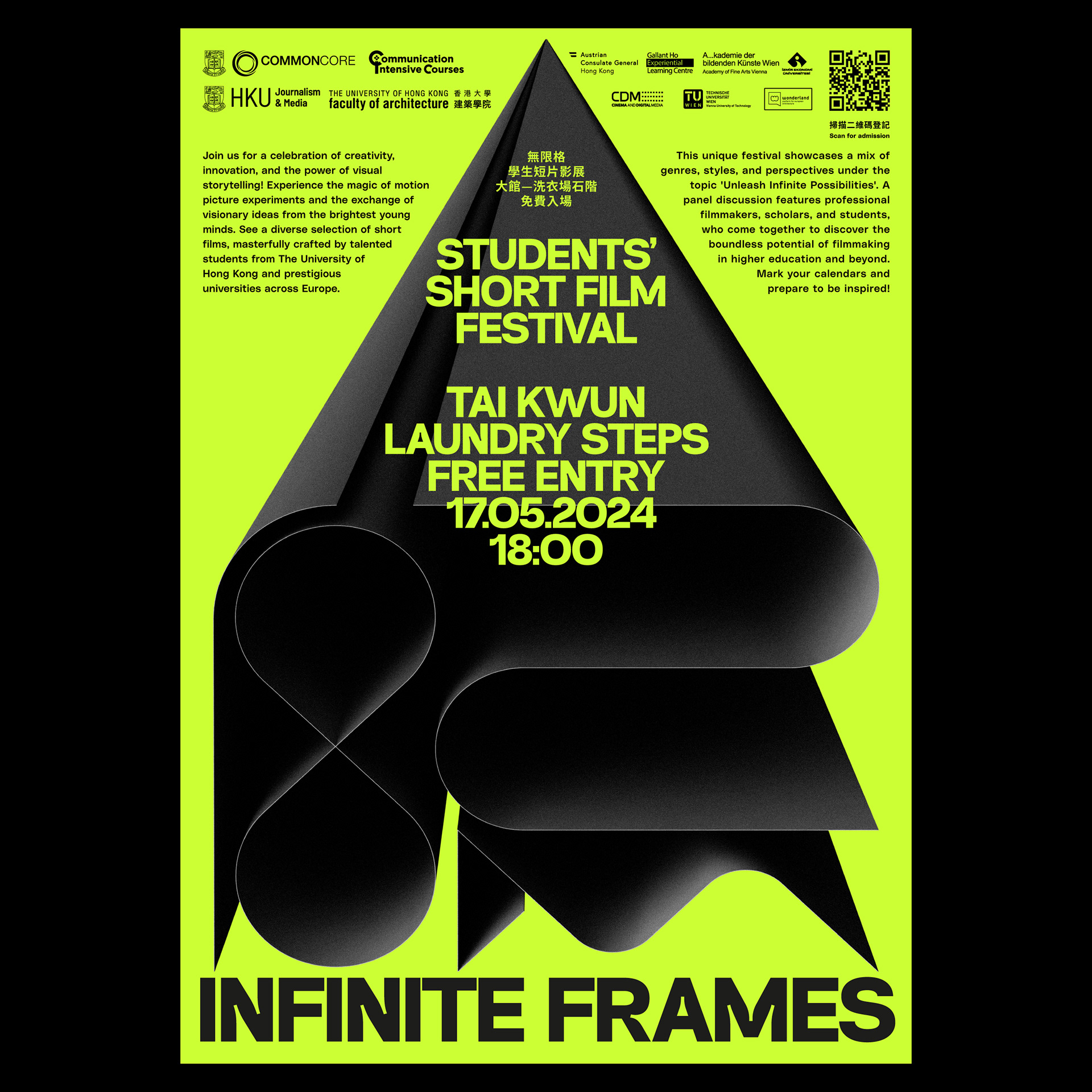 “Infinite Frames 無限格” is a student's short film festival showcasing a diverse selection crafted by talented students from The University of Hong Kong and prestigious universities across Europe. This festival features a mix of genres, styles, and perspectives under the topic “Unleash Infinite Possibilities”. The panel discussion features professional filmmakers, scholars, and students, who come together to discover the boundless potential of filmmaking in higher education and beyond. The key visual is the abstract amalgamation of the ∞ symbol and the simplified forms of the Chinese character 無 (Nothing / No) and 限 (Limit). The perspectival presentation and the animation featuring light and shadow movement of the objects resonates the film projection as a response to the event nature. Client — Common Core Curriculum, Journalism and Media Studies Centre, Faculty of Architecture, The University of Hong Kong Typeface in use — Mersad by Nika Khipashvili